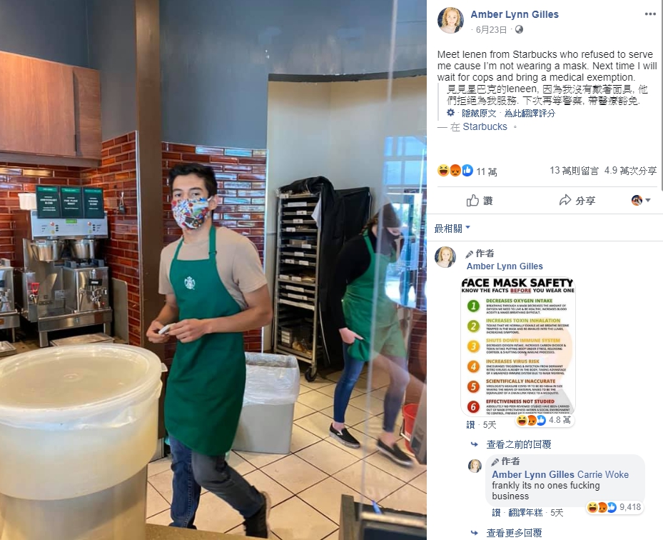▼一名女子前往星巴克消費,被店員以沒戴口罩為由拒絕服務。(圖/翻攝自臉書Amber Lynn Gilles)