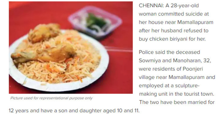根據《印度時報》報導,現年28歲的女子索米亞(Sowmiya)住在泰米爾納德邦,在一家塑料工廠當女工,她和32歲丈夫馬諾哈蘭(Manoharan)結婚12年,育有一個10歲兒子和11歲女兒。索米亞在本(6)月24日得知一家新開的餐廳有買一送一的優惠,因此拜託老公去買薑黃雞肉飯,但很快就被搶購一空,馬諾哈蘭只好買普通的薑黃飯回家,索米亞頓時希望落空,為此感到相當生氣,拒絕吃普通的薑黃飯,馬諾哈蘭只好把薑黃飯送給鄰居,隨後就去上班。