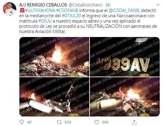 ▼美國私人飛機驚傳遭委內瑞拉擊落。(圖/翻攝自委內瑞拉軍方推特)