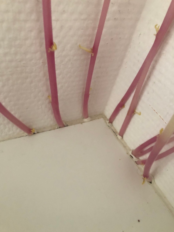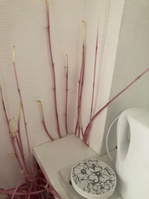 疫情趨緩後,波瑞隔了3個月才回到自己的公寓,沒想到一打開大門就看到廚房牆面上佈滿了「紅色觸手」,因為意想不到的謎樣觸手,讓她相當驚訝。後來上前仔細一看,想起是3個月離家前,到超市買馬鈴薯發芽了,因為有整整一袋的馬鈴薯,才讓整個牆面蔓延觸手。波瑞花了好幾個小時才把大量的馬鈴薯枝芽清除乾淨,之後更是把拔除的芽種在田裡,並說「很期待會長成怎樣」。