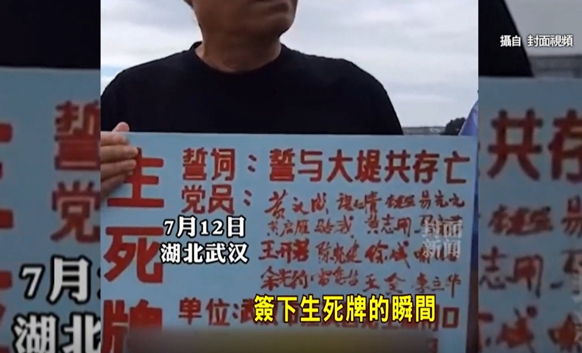 大陸水患至今沒有減緩的跡象,長江中下游水位持續上升,創下鄱陽湖、太湖有史以來最高水紀錄,在湖北武穴長江邊上就有個小村落,號召將近40位村民在生死牌上簽名,不會離開自己的家,誓與堤防共存亡。