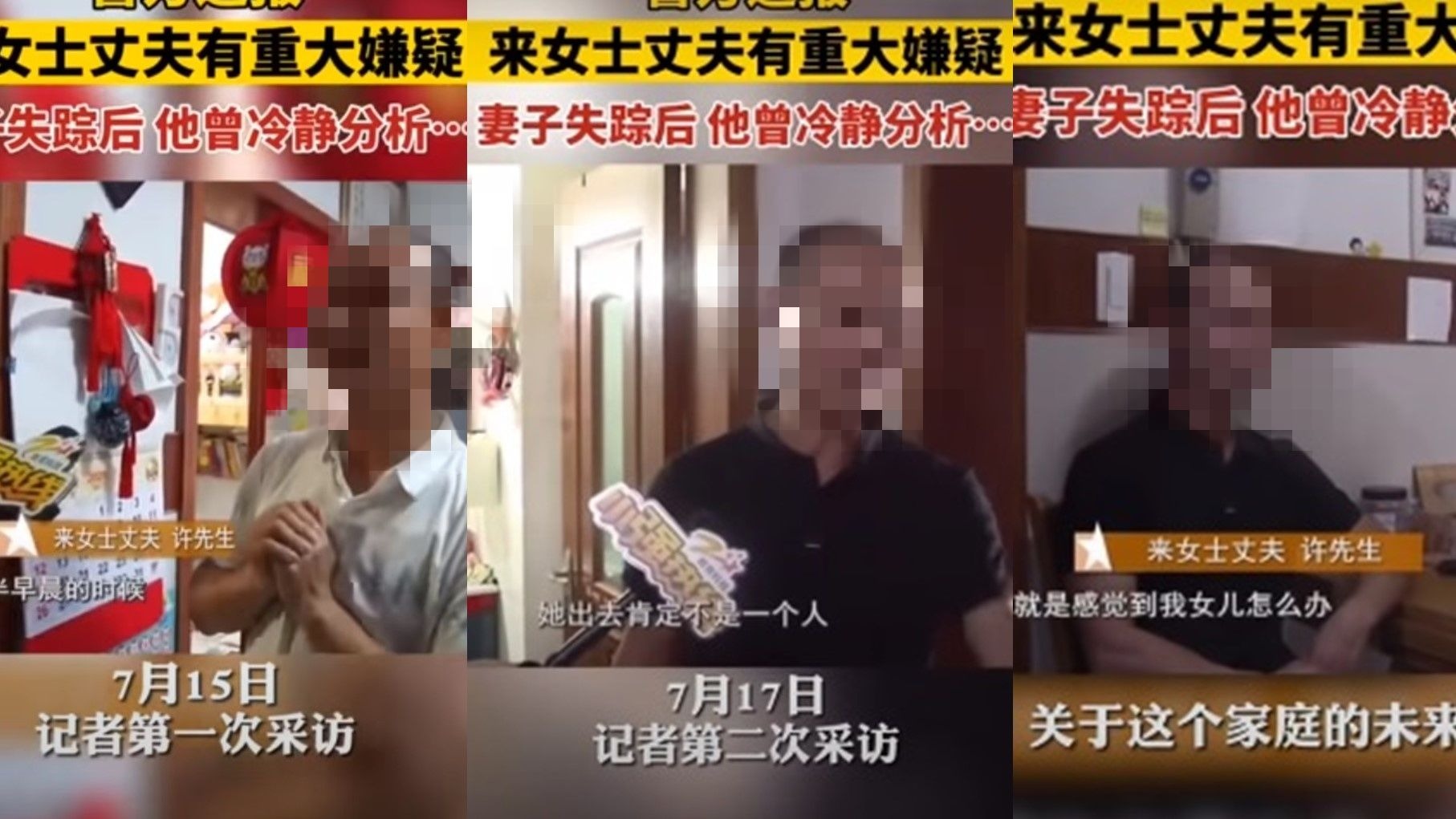 警方在接獲通報後,隨即進行4次地毯式搜索,但案情都沒有任何進展,多家大陸電視台也幫忙協尋,並專訪許姓男子,許男在接受3次訪問時,分別表示「之前沒有妻子突然出去的情況」、「我們住了那麼多年,她絕對不是一個人出去的」、「我只想到女兒怎麼辦,我生活怎麼辦,我老婆什麼時候回來到底,是死是活都不知道。」