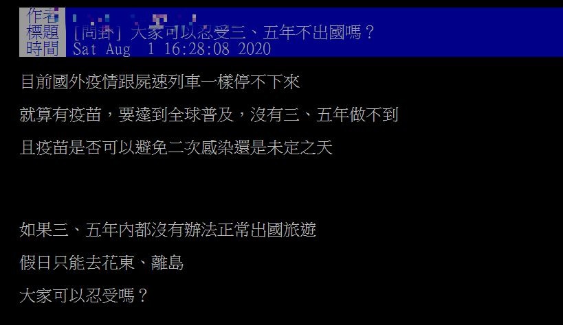 有名網友近期在PTT上發文,表示目前國外疫情跟屍速列車一樣停不下來,就算疫苗成功研發,要達到全球普及,也需要3到5年,且就算注射疫苗,是否可以避免2次感染還是未知數,原PO也在文末問廣大鄉民「如果3、5年內都沒有辦法正常出國旅遊,假日只能去花東、離島,大家可以接受嗎?」