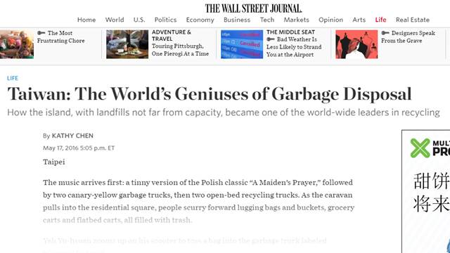 根據《華爾街日報》的報導,標題點明「台灣:全世界垃圾處理的大咖」(Taiwan: The World's Geniuses of Garbage Disposal),並根據台灣環保署的統計資料,2015年全台資源回收率達55%,也從非營利組織「星球援助」(Planet Aid)的資料得出,腹地少但人口卻很多的台灣,資源回收率高達60%,媲美奧地利63%、德國62%等國家,遠遠超過南韓49%、英國39%、美國34%、日本21%等已開發國家,還大讚台灣從昔日的「垃圾島」變成資源回收的國際典範!
