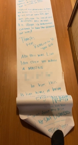近日美國一名家長將一段影片PO到Reddit討論區,影片中,該名家長收到了一封超級長的手寫信,信上文字用不同顏色的筆寫下,裡面還出現不少不雅字眼,最讓人驚訝的是,這封信可以從該名家長的房屋底部一直延伸到另一頭,長度足足有15公尺。
