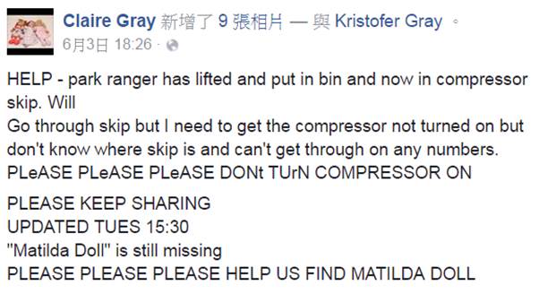 英國一位母親葛蕾(Claire Gray),在臉書期盼外界的幫助,因為她最愛的布娃娃不見了,葛蕾丟掉的並不是非常昂貴的娃娃,但卻是「已逝