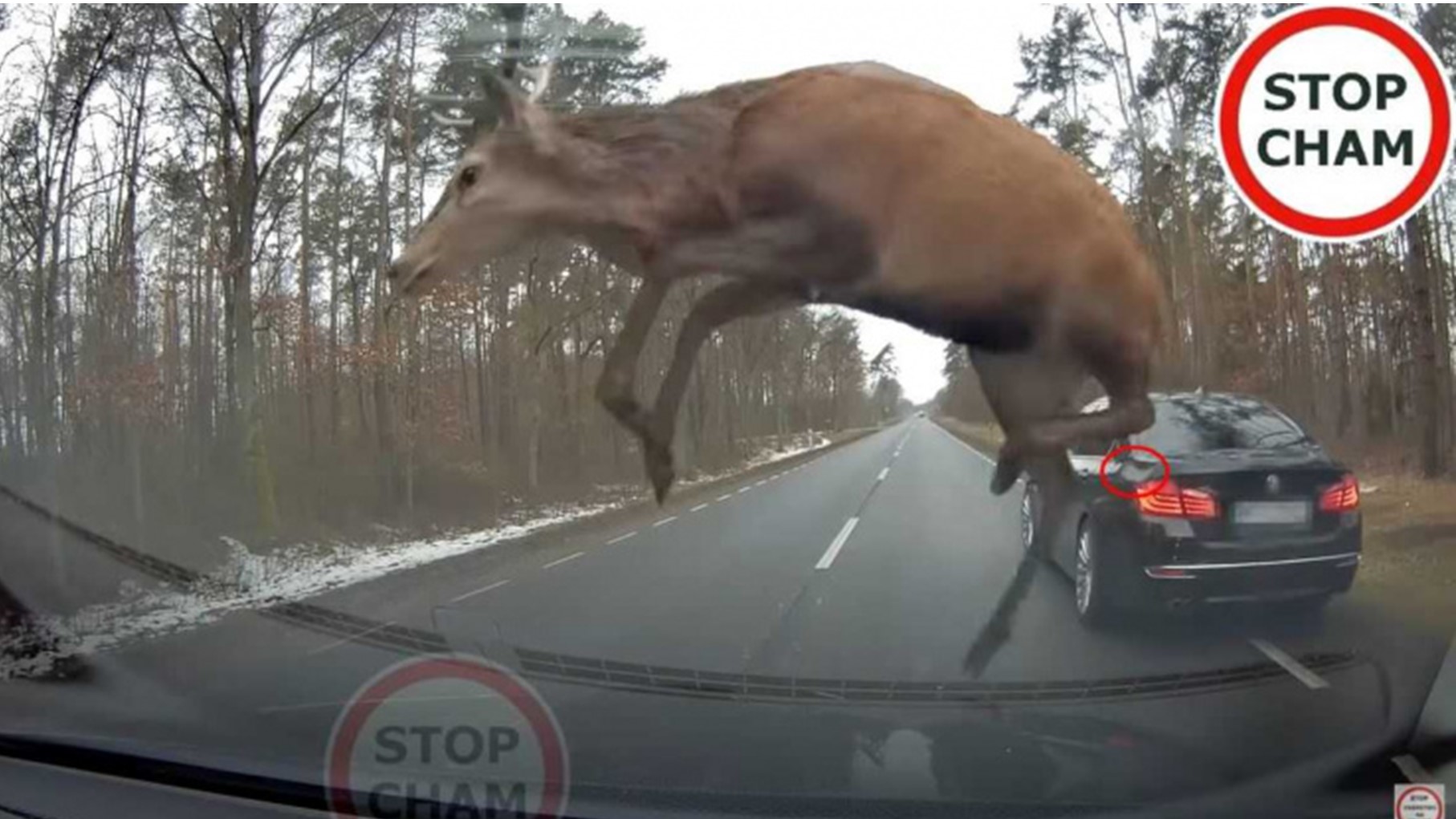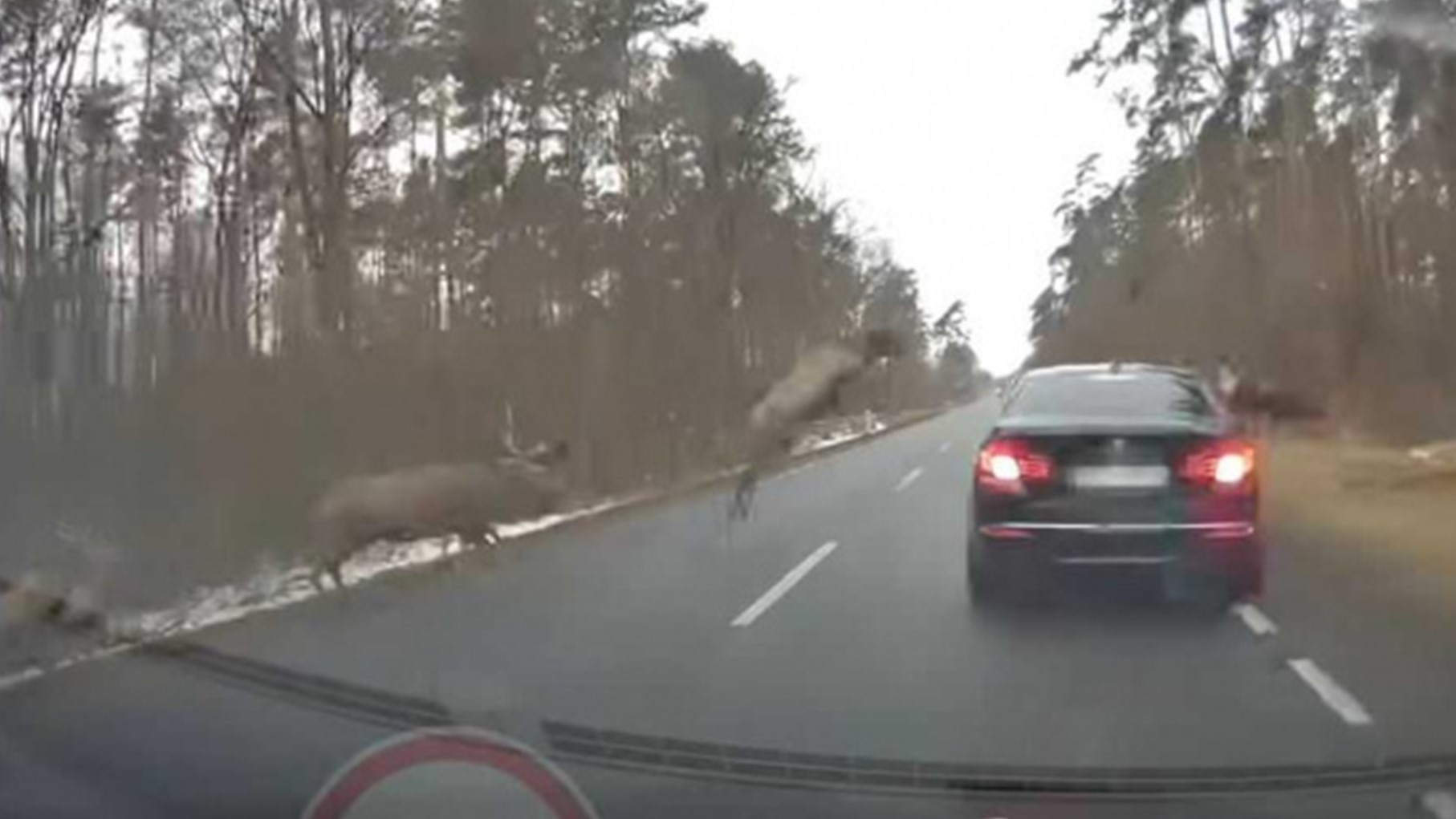 波蘭一名駕駛,上個月(2月)26日中午駕車行經普烏圖斯克(Pułtusk)附近的森林道路時,突然冒出鹿群紛紛自車頂一躍而過;其中,卻有一隻鹿疑似未算好起跳時間,落地過早直接摔趴在後車廂,後方車輛駕駛將此影片分享至YouTube頻道,截至目前為止,已獲得328萬人次觀看。