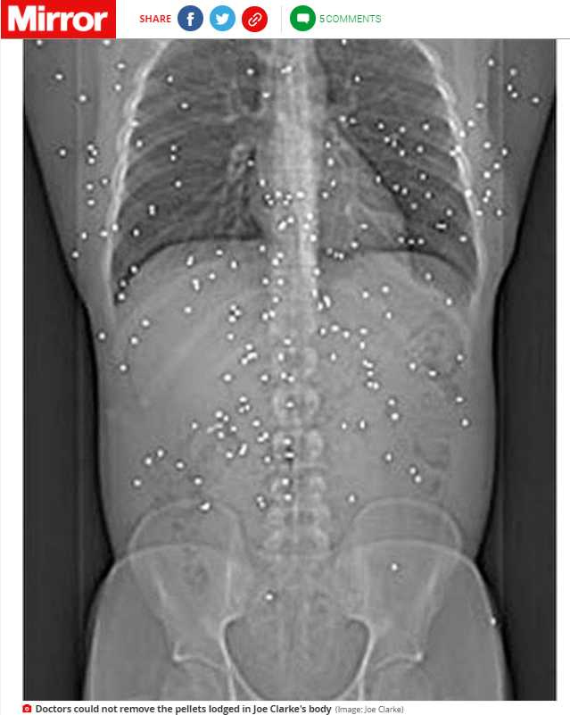 英國一名男子15年前遭歹徒拿槍掃射,身體內中了150粒子彈,沒想到這樣的傷卻沒有讓他丟掉小命,反倒是奇蹟般地活到現在,雖然沒有喪命,但他卻不認為自己是「幸運」的,因為這些子彈讓他留下不少後遺症,甚至令他興起「為何自己還在世」的想法。