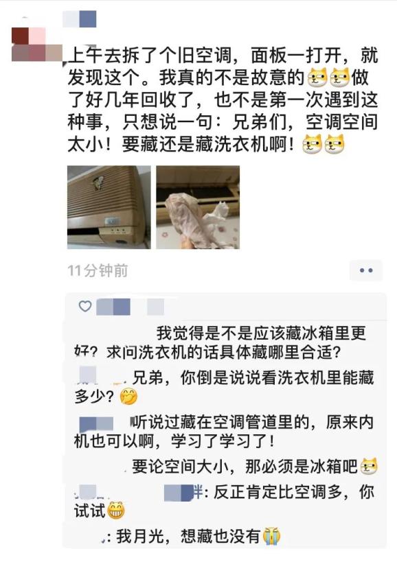 張男發文透露此事,表示「我真的不是故意的,做了好幾年回收了,也不是第一次遇到這種事情」,每次遇到這種情況都有些尷尬的張男,看到私房錢竟然藏在冷氣機後,笑喊「兄弟們,空調(冷氣)空間太小!要藏還是藏洗衣機啊!」貼文曝光後,立刻引起廣大的討論,網友一看後也笑翻,表示「我覺得是不是應該藏冰箱裡更好」、「兄弟,你倒是說說洗衣機裡能藏多少」、「要論空間大小,那必須是冰箱吧」。