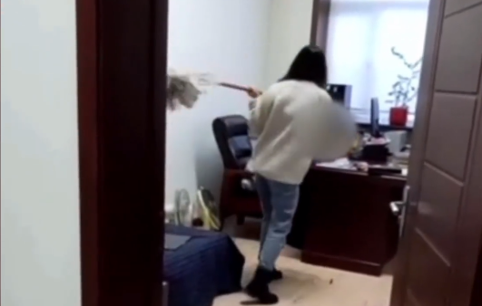 這段長近10分鐘的影片近期在網路上瘋傳,只見畫面中一名長髮,穿著白色上衣、牛仔褲的女子衝進辦公室,嘴裡不斷念念有詞,隨後拿起拖把抽打王姓副主任,王男不但沒有抵抗,還被嚇得不斷喊著「我錯了,我沒想那麼多,就是開玩笑,能不能饒了我」。