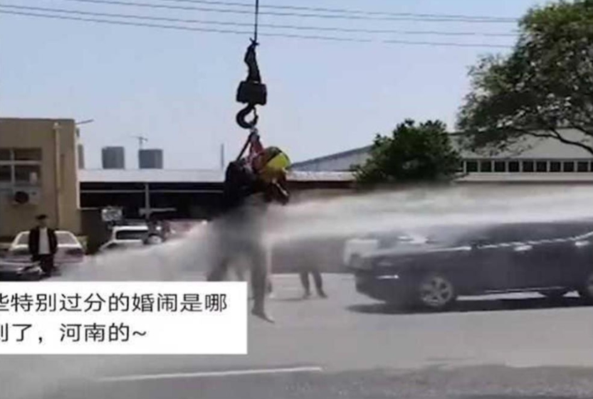 根據「巴士的報」等媒體報導,河南一對新人本月1日舉行婚禮,新郎的朋友特意準備了吊車和水車,先將新郎綁好吊起,再用高壓水柱對著新郎噴灑。影片顯示,水柱強勁的衝擊力不只將新郎噴到在空中轉圈,西裝和褲子還直接裂開,變成片片碎布,整個後背和左大腿直接跑出來見人,現場圍觀的朋友則是拿著手機紀錄整個過程邊哈哈大笑。