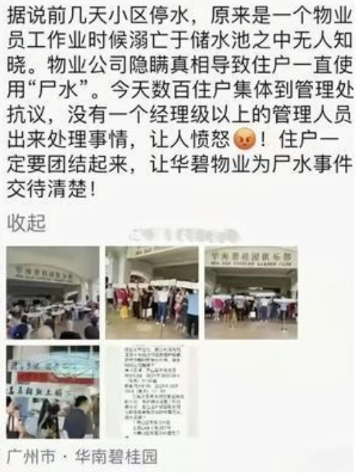 中國大陸微信朋友圈流傳一則短片,內容是廣州華南碧桂園小區住戶,手舉「公布屍水真相」「草菅人命」「欺瞞業主(住戶)」等標語的抗議短片,起因據傳是社區管委會1名員工在蓄水池溺斃,但管委會選擇隱瞞消息,讓住戶喝了好幾天的「屍水」。