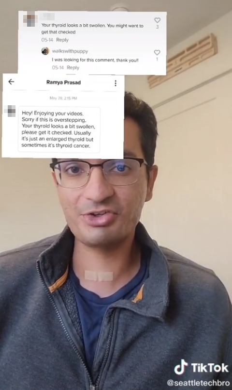 根據外媒報導,一個名叫西雅圖兄弟(Seattle Tech Bro)的網紅,他自4月份開設抖音帳號,至今累積了2萬名粉絲追蹤。他近日發布一則影片透露,有粉絲告訴他「你的甲狀腺看起來有點腫,請檢查一下。通常只是甲狀腺腫大,但有時是甲狀腺癌」,他因為收到這則訊息感到非常焦慮,趕緊跑到醫院就醫,並且進行一連串的檢查。