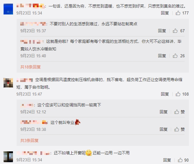 不過,父母的省電舉動,令不少網友感嘆留言,「還是因為窮,不感覺到溫暖,也不感覺到好笑,只感覺到莫名的難過」、「反過來想,到現在才裝空調,家裡條件應該不太好,要能理解」、「何不食肉糜的太多了」。