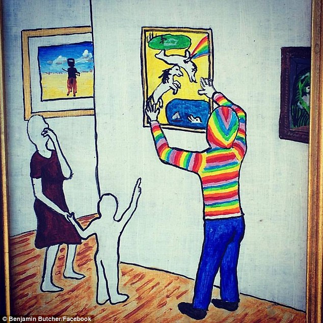 布徹張貼在美術館的畫叫做「自我實現」,畫中就畫著他將畫貼在博物館這一幕。他在簡介中寫道,在這個時代,媒體可以讓我們自由的對公眾發表觀點,任何事都無法左右我們的思想,作為一個藝術家,希望能在這裡能用此畫博大家一笑。