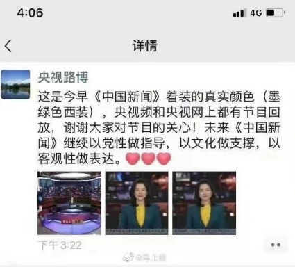 ▼央視澄清該名主播身穿的是墨綠色的衣服。(圖/翻攝自馬上談 微博)