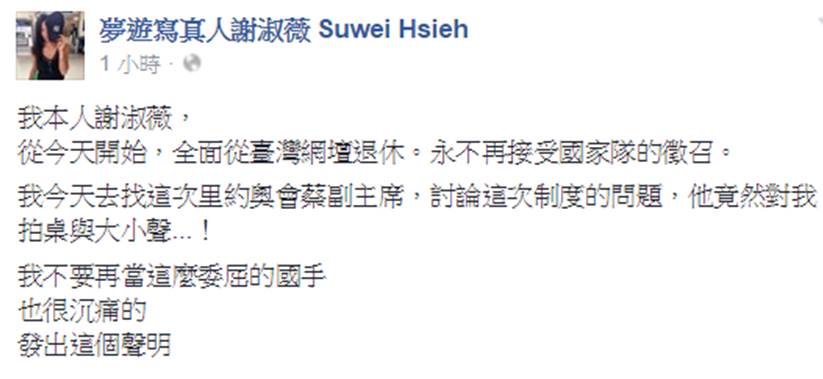 我本人謝淑薇,從今天開始,全面從臺灣網壇退休。永不再接受國家隊的徵召。我今天去找這次里約奧會蔡副主席,討論這次制度的問題,他竟然對我拍桌與大聲...!我不要再當這麼委屈的國手,也很沉痛的發出這個聲明。