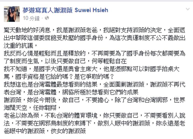 驚天動地的好消息,我是謝淑薇老爸,我絕對支持淑薇的決定,全面退出中華隊這個委屈飽受欺壓的國手身分,為這次奧運制度不公不義做出沈重的抗議,我反而心情是輕鬆而且是釋放的,不再需要為了國手身分每次都需要為了制度而生氣,以後只要做自己,何等輕鬆自在我不知道,是國手大還是奧會主席大,他是憑那點可以對國手拍桌大罵,國手資格是它給的嗎?是它爭取的嗎?我想這也是台灣霉體最想看到的結果,全面圍剿謝淑薇,謝淑薇不再代表台灣,是台灣霉體,網協所急於想看到它們的成果。謝淑薇,妳從今爾後,做自己,不要擔心,除了台灣和台灣網邪,世界海闊天空,任妳翱翔,老爸以妳為榮,不恥台灣的體育環境,妳只要做自己,不需要看別人說法,不需要在網邪鳥制度的束縛下,做別人眼中的謝淑薇,妳永遠是老爸眼中的謝淑薇,俠女的謝淑薇。