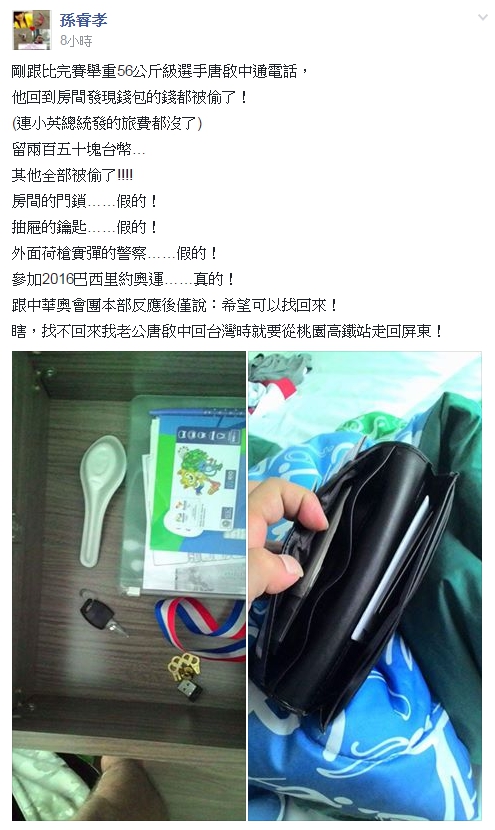 PO文中孫睿孝寫道:「房間的門鎖……假的!抽屜的鑰匙……假的!外面荷槍實彈的警察……假的!參加2016巴西里約奧運……真的!」雖然已經跟中華奧會團本部反應,但也只能希望可以找回來!最後,孫睿孝也不忘幽默表示,「瞎,找不回來我老公唐啟中回台灣時就要從桃園高鐵站走回屏東!」