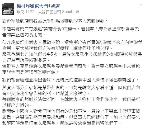 一名在南韓炸雞店工作的台灣人在臉書非公開社團上「爆料公社」上PO文寫道「推打我們台灣人就是不對,不共戴天」。原PO說,5名陸客到餐廳用餐,先以小孩子餓為由,先泡一碗麵給小孩吃,接著竟又去買3碗泡麵,理由是店家沒有提供飯麵類,一開始經過原PO勸說有先把泡麵收起來。但過沒久仍把另外2碗泡麵拿出來吃,一名大陸籍店員先向前制止,卻被罵哭,接著台灣店員再前往制止,結果陸客竟亮出刺青,嗆聲說自己是「流氓」,並說因為自己罹患糖尿病,因此在吃藥前要吃飯,於是原PO就從3碗中回收一碗,接著咆哮、衝突就開始展開。