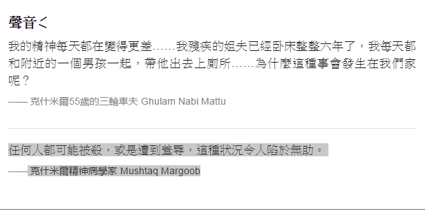 報告還指,在印度控制的克什米爾地區,每個成年人一生中平均會經歷7.7次創傷經歷,例如自己或家人捲入暴力衝突、殘疾或不正常死亡等。而其中,93%的人所經歷或見證的創傷與外部衝突相關。