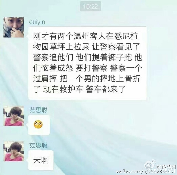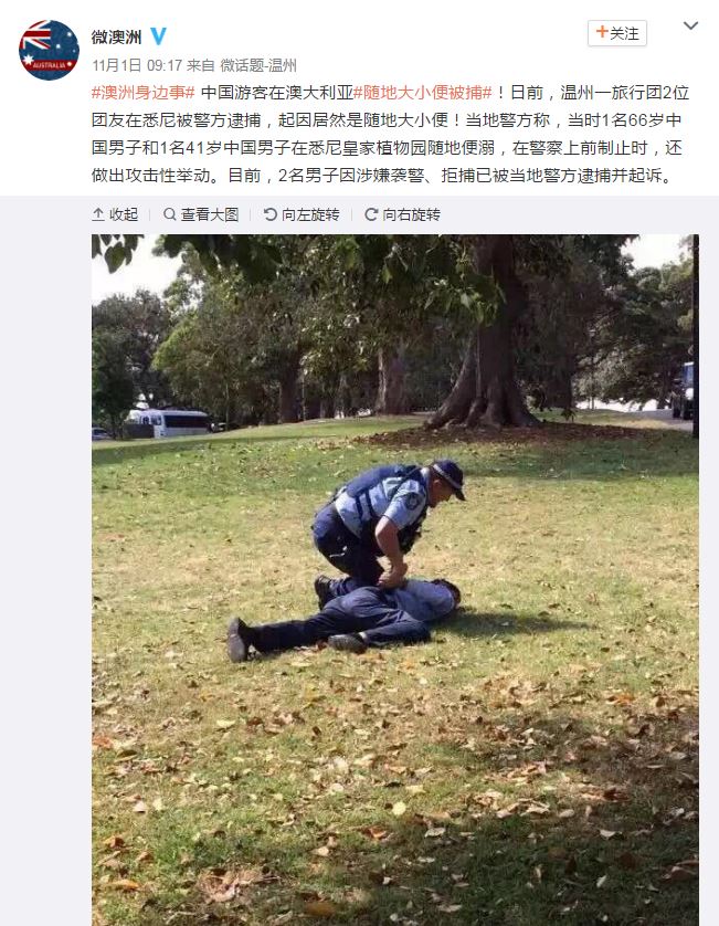 前天(1日)微博帳號「微澳洲」在網路上曝料,大陸一個溫州旅行團,有兩名團員分別為66歲及41歲的大陸男子,在雪梨皇家植物園被當地警方逮捕,原因竟然是因為他們兩個人在植物園的草地上「隨地便溺」,巡邏警員看見之後,隨即上前制止,沒想到這兩名大陸遊客先是辯稱自己患病,倒在地上不起來,眼見這招沒用之後,還對警方做出攻擊性的動作。