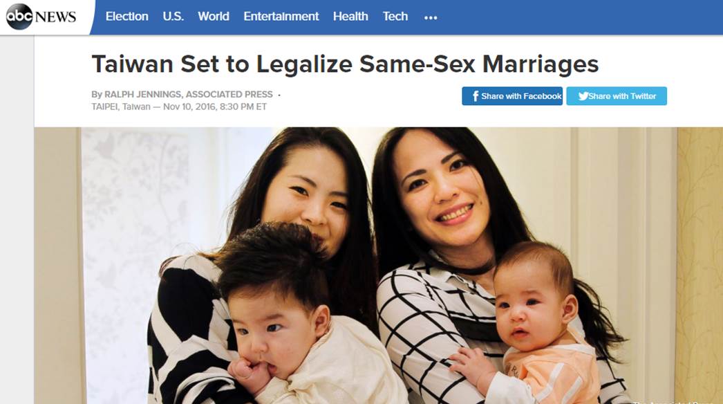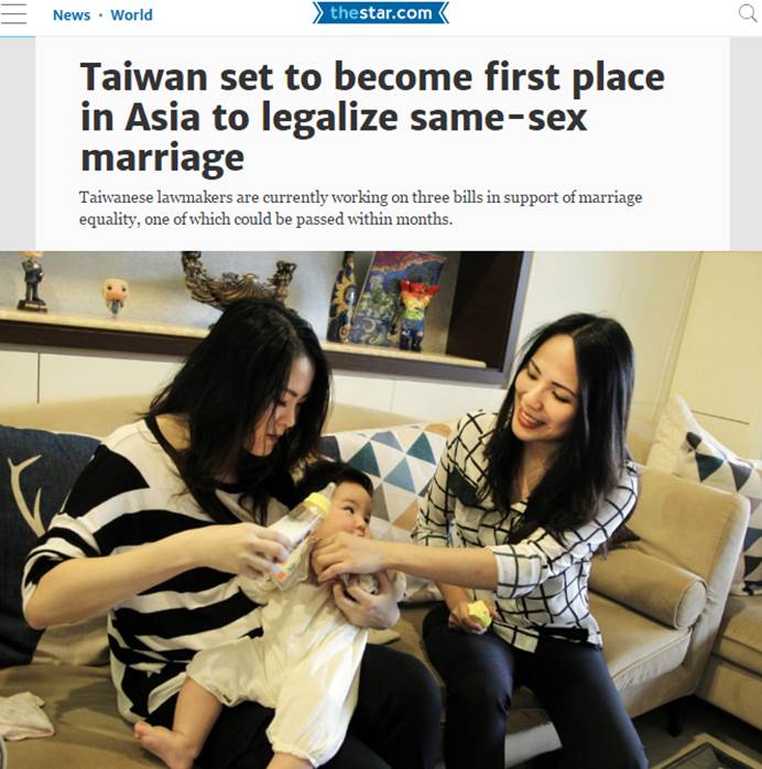 綜合外媒報導指出,台灣同志婚姻合法化後,同志伴侶將能參與彼此在醫療、法律及教育上的決定。台灣在蔡英文總統支持同性婚姻平權下,此案有希望在近幾個月內通過,另外報導內容也提到,在台灣公開出櫃的名人不多,且同志還需要克服傳統性別以及傳宗接代的壓力,其子女恐怕也得承受巨大的社會壓力。