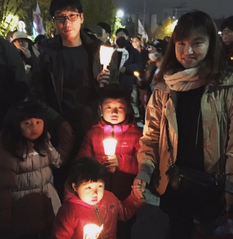南韓總統朴槿惠下台,抗議者高舉旗幟、標語,手持蠟燭,燭光在黑夜中閃爍照亮首爾街頭,主辦單位在晚間宣布,200萬人參與此次抗議行動,破歷史紀錄,有人形容南韓示威抗議的戰力「是反川普的千倍以上」。