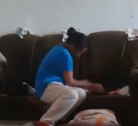 從影片中可以清楚地看到,身穿藍衣白褲的女子把看似剛出生沒多久的嬰兒放在沙發上,坐在一旁毫不留情地用巨大的手狠甩嬰兒巴掌,即使嬰兒被打到臉頰通紅,整個屋內都迴盪著嬰兒的哭喊聲,但女子依然憤怒地掌摑伺候,好似遇到仇人一樣心狠手辣。