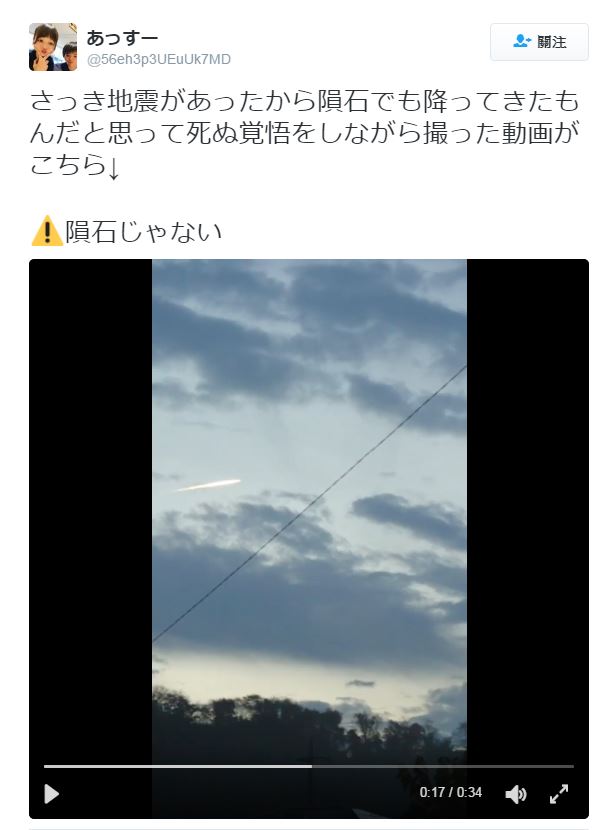 而隨後又有一名日本女生在Twitter上PO出一段驚人異象,在這段影片中,只見昏暗的藍天,出現一道異常明亮的光束由左到右劃過天空,畫面拉近之後,更能感覺到它的移動速度相當快。這位女生懷疑是隕石即將墜落,還驚恐地表示「我有死亡的心理準備了」,不過最後卻又否認是隕石,也沒有說明拍攝地點。