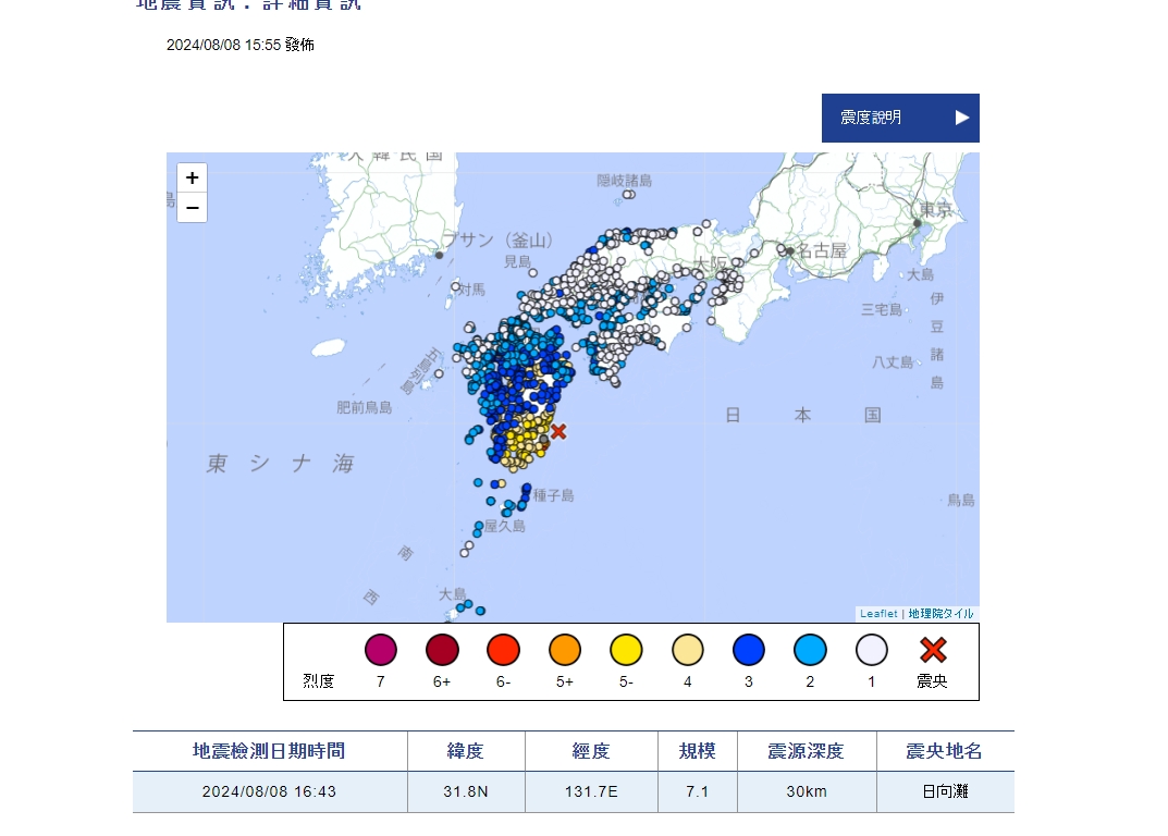 日本於當地時間今(8)日下午16時43分發生規模7.1地震,震央位於日本宮崎縣東側的日向灘,最強震度6弱。