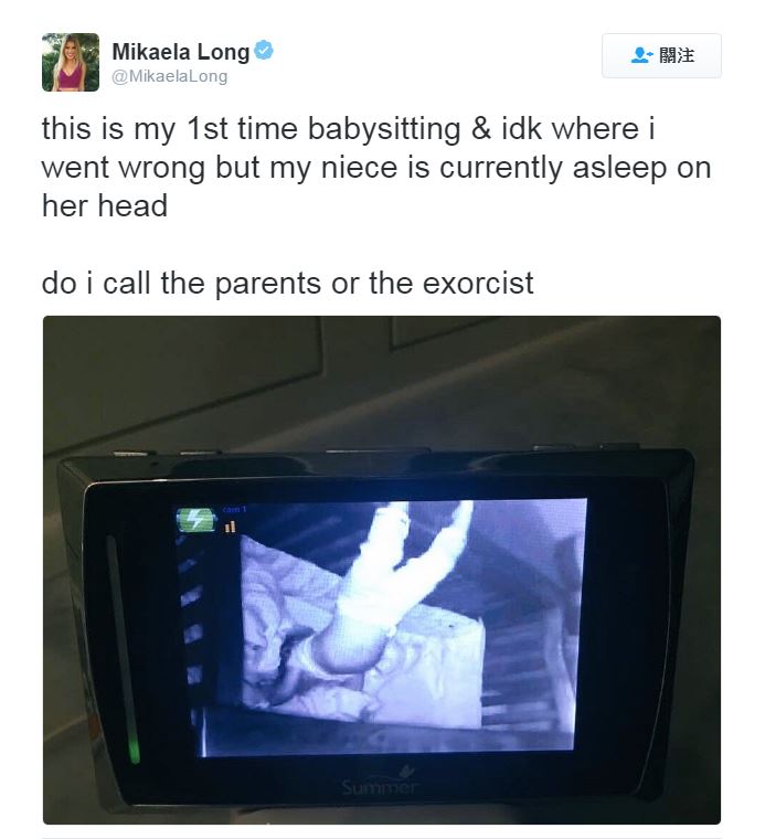 美國加州有一名叫米凱拉(Mikaela Long)的女生,因為時常PO出很多自己拍的搞笑影片,而在網路上爆紅,成為擁有眾多粉絲的網路紅人。這個月8日晚上,米凱拉在家中幫忙照顧還是小嬰兒的姪女,她表示這是她第一次當保母,而姪女在房間睡覺的時候,米凱拉則透過嬰兒監視系統,來看姪女有沒有乖乖睡覺。