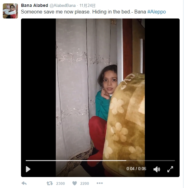 年僅7歲阿拉貝(Bana Alabed)是敘利亞小孩,而且和媽媽法蒂瑪和另外兩個弟弟一起住在敘利亞第一大城阿勒頗(Aleppo)。從9月24日開始,她用文字、照片,甚至是影片,記錄著