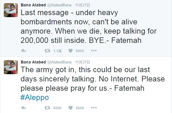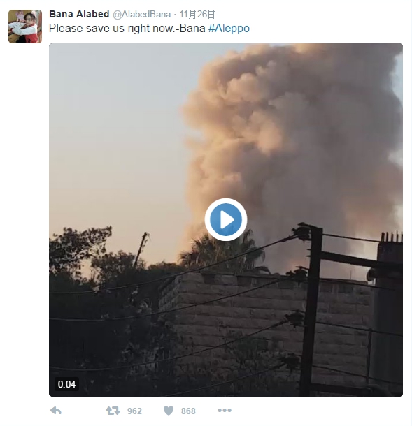 此外,從她貼出的影片中可以看到,阿勒頗因為受到轟炸,房子變得殘破不堪,所到之處全都成了斷垣殘壁、破瓦殘屋,遠方因為轟炸而直竄天際的濃煙,非常驚人。而就在26日,阿拉貝連發好多篇文章,寫著「就是現在,我們好害怕,願天保佑」、「請救救我們」。