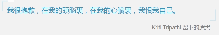 4月27日,17歲的 Kriti Tripathi 通過了著名的印度理工學院(Indian Institute of Technology,IIT)聯考第一階段考試;4月28日,她從五層樓的頂層跳樓自殺,留下5頁遺書解釋結束生命的原因,「因為她不想追求工程職業生涯」,警方說。