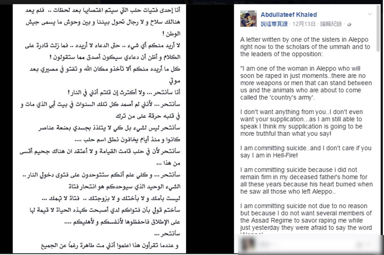我要自殺,並非毫無理由,因為我不想被政府軍口中稱的「淨化般」強暴,阿勒頗的審判日即將到來,和這個相比,地獄可能好一些。我知道所有人會因為我下地獄而團結,這是我唯一能讓大家團結的事,一名女人的自殺,不是你的母親、姐妹、妻子,而是一名你們毫不關心的女性。最後我要說,你們的判決對我來說沒有任何意義,所以也不用浪費口舌和你們的家人說了!當你們讀到這封遺書時,我依舊是純潔,但你們不是!
