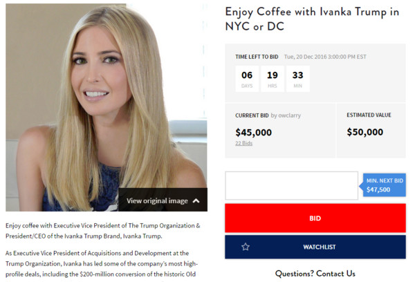 競標做公益,但是競標的物品非常特別,竟然是和伊凡卡在紐約或華盛頓DC喝咖啡的權利!此拍賣資訊上線後各界紛紛參與競標,16日時價格已經攀升至7萬2888美元(約233萬元新台幣)。但沒想到這個和第一千金約會的慈善咖啡見面會竟然喊卡,已經從拍賣網站上悄悄下架。