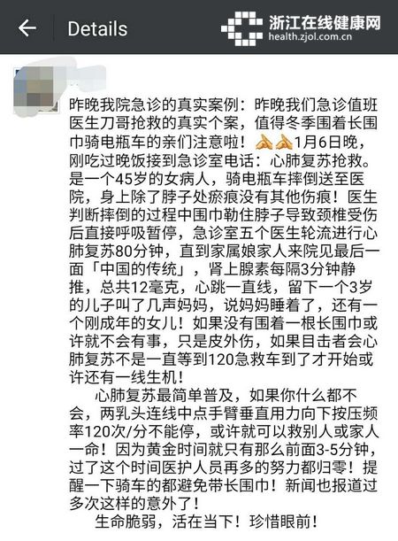 醫師表示,如果目擊者在遇到這類的情形,可以幫忙做心肺復甦術,「只要將手臂放在患者的兩乳頭中間點,垂直向下用力壓,按壓頻率為一分鐘100-120次」,就可以搶在3到5分鐘的黃金時間中,有機會救回傷者,另外提醒戴圍巾騎車的民眾,要避免圍過長的圍巾,且圍巾兩端要繫好,才能避免憾事發生。