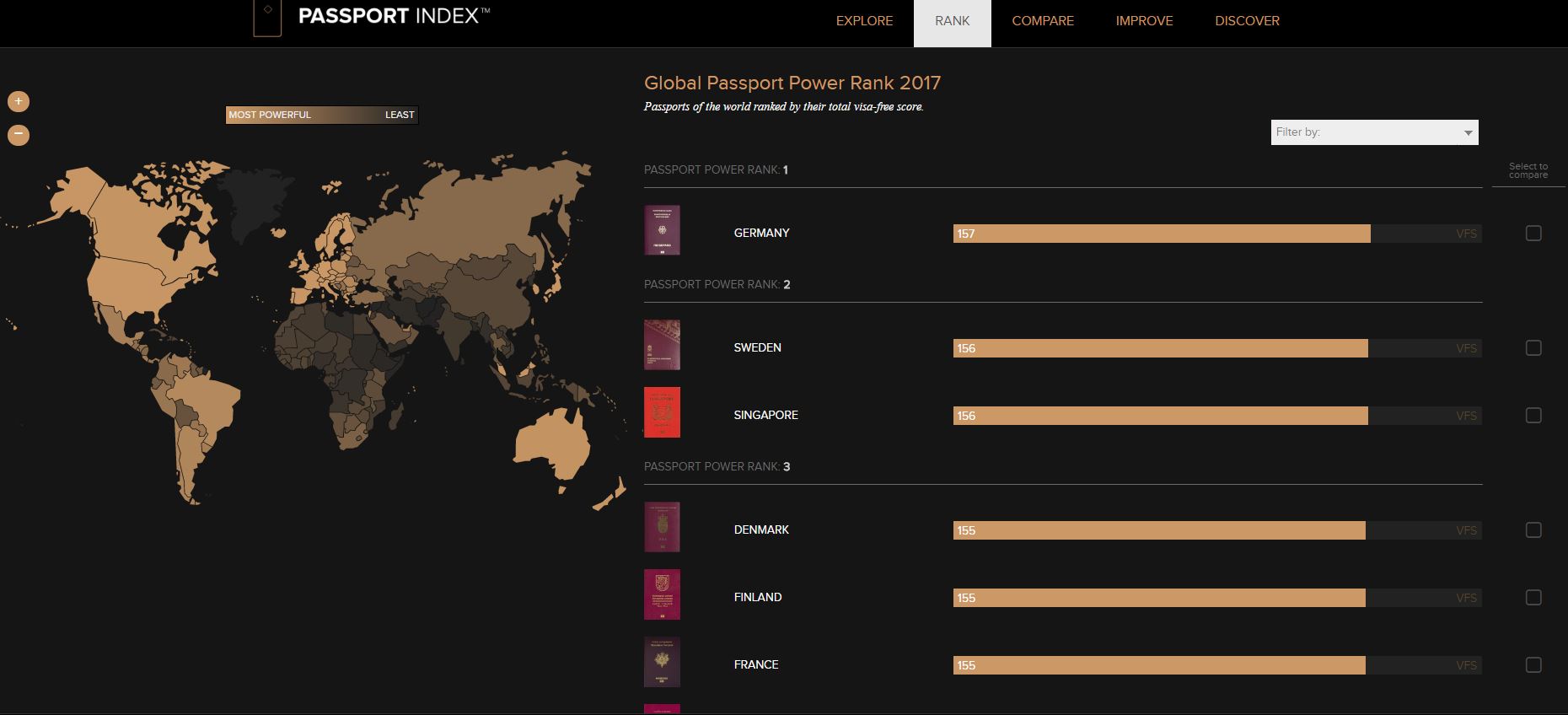 從「Arton Capital」公布的排名可以看到,第1名的德國護照,不需申請簽證或是落地簽就可以入境的國家高達157國,新加坡和瑞典則同時以156個國家同居第2,第3名的美國、英國、丹麥、芬蘭、法國、西班牙、挪威、瑞士都是155個國家,第4名有義大利、荷蘭、比利時、奧地利、盧森堡、葡萄牙、日本,第5名是馬來西亞、愛爾蘭、加拿大、紐西蘭。