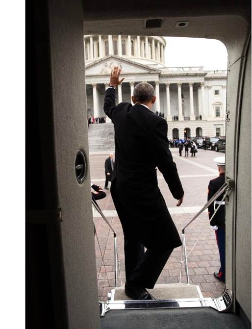 而白宮首席攝影師蘇札(Pete Souza)也在這歷史的一刻,捕捉到歐巴馬離開「橢圓形辦公室」以及搭著直升機離去後的照片,當歐巴馬乘坐的直升機,離白宮漸漸遠去的時候,他回頭一望,藉由相機的鏡頭,不用一句話一個字,歐巴馬的難捨之情溢於言表。