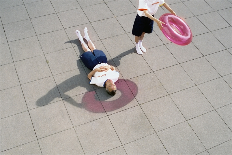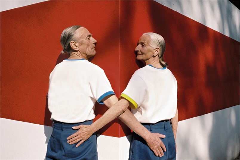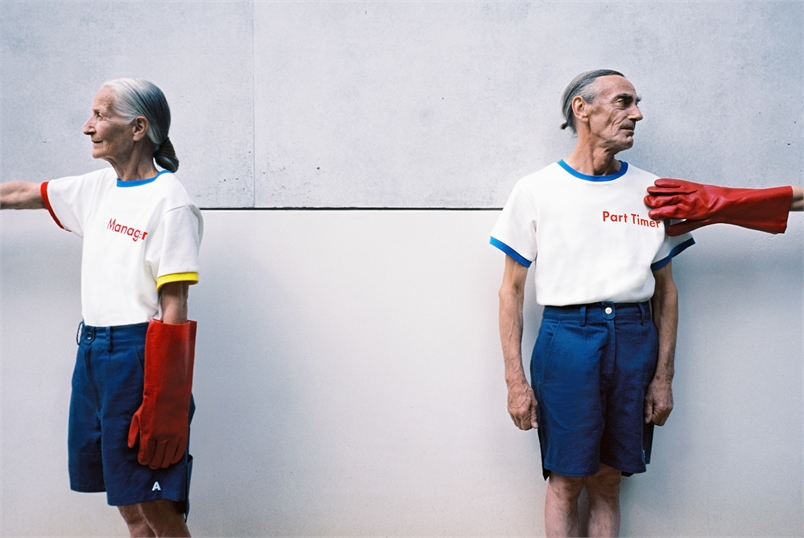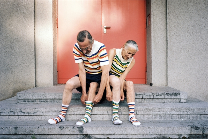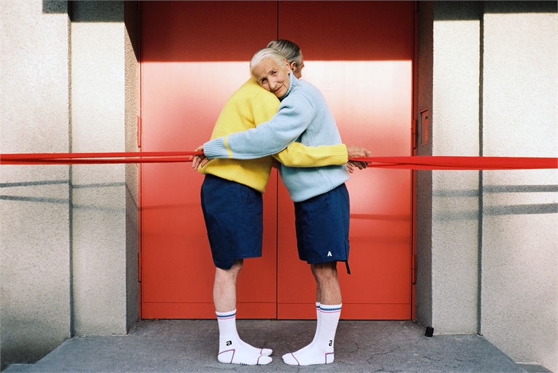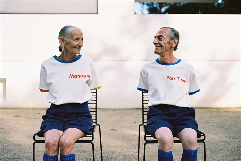 這一系列的放閃照色彩鮮豔、畫面乾淨簡單,老夫老妻也顛覆以往情侶照的既定印象,兩人穿著年輕人的衣服,就好像回到當初相識的青春歲月,時而對望、相擁,時而溫柔地摸著對方的頭,還互相幫對方穿襪子,看起來俏皮又有趣。