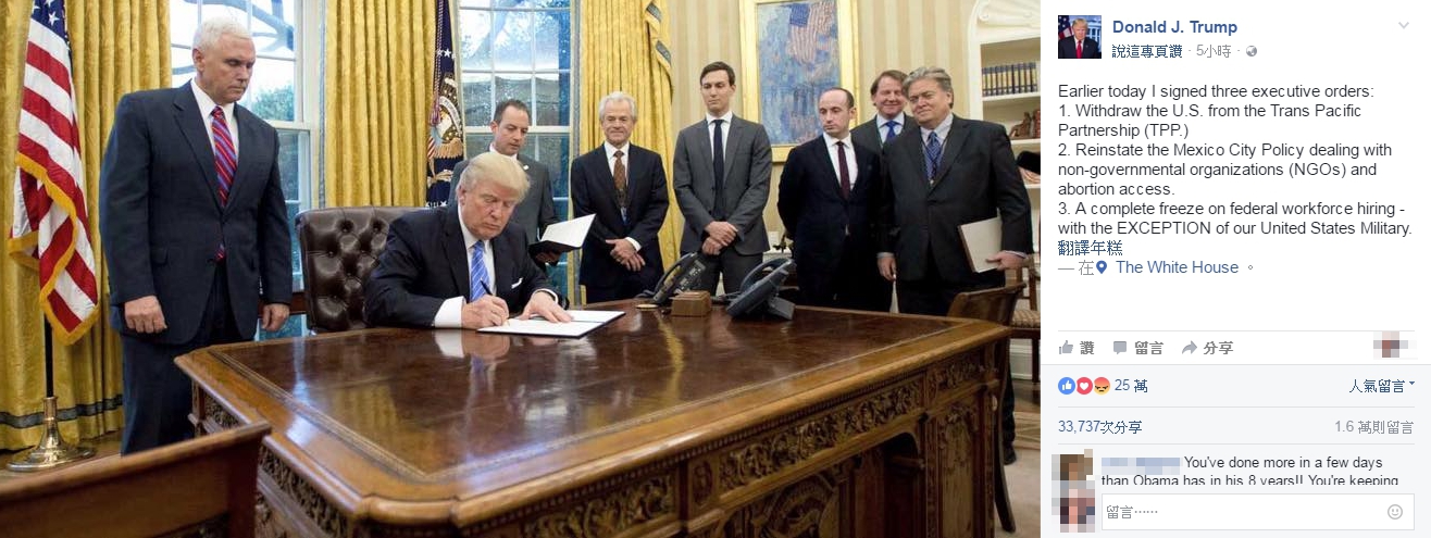 而除了TPP外,川普還另外簽了2道行政命令,包括凍結聯邦政府人事招聘案和禁止將補助給提供墮胎的美國海外非政府組織。