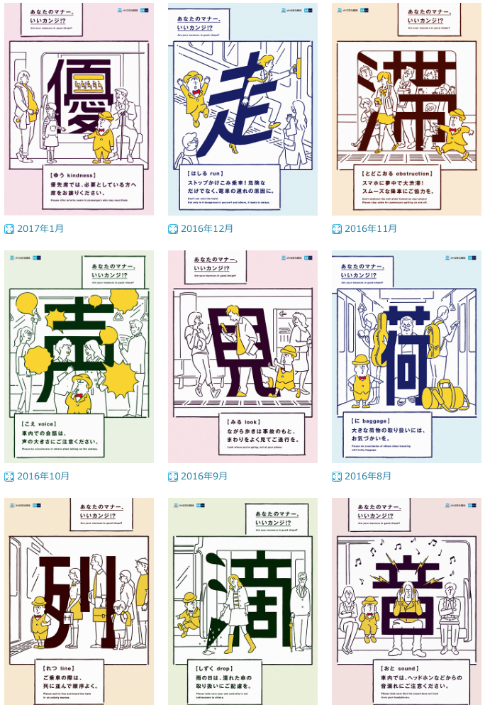 就從地下鐵開始說起吧。我們都已經覺得日本人在地鐵上夠有規矩了,還需要特別宣導搭車的規矩嗎?但迄今走在東京地下鐵車站裏,仍能不時見到禮儀道德宣導的海報。這系列宣導海報,全年度12個月貫穿同一個主題,每個月更新一次,早從1974年9月起就已開始實施。在東京的地鐵車廂裏,你應該怎麼做,不要令自己丟臉也不要造成別人的困擾,這樣的禮儀教育已持續45年之久,而且還在繼續做下去。