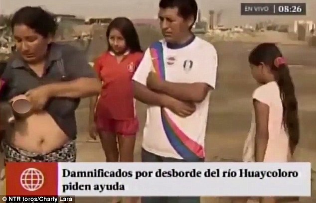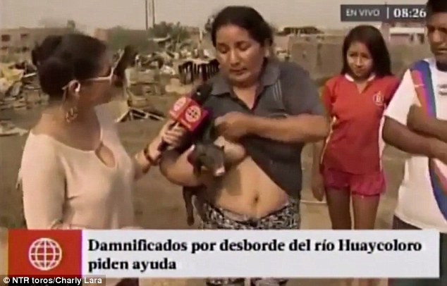 因為大雨侵襲,在祕魯利馬(Lima)的民眾近日飽受淹水之苦,記者深入災區採訪,一位女養豬受災戶,在受訪時竟當著攝影機以及許多圍觀民眾的面,掀開上衣做出讓小豬仔哺乳的動作。