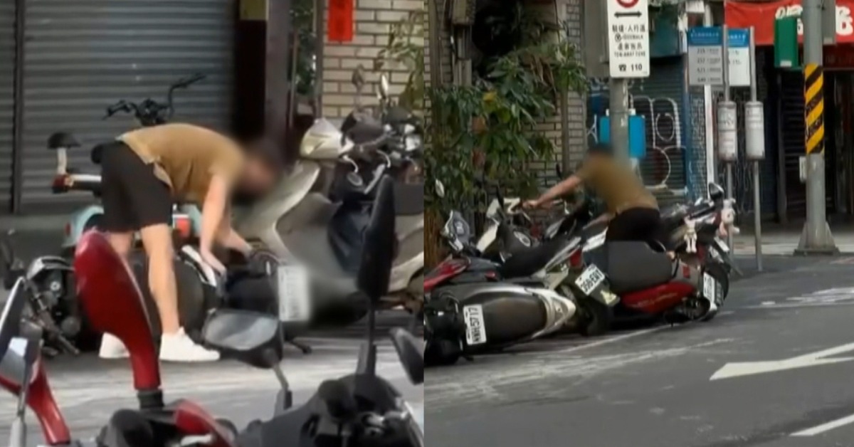外籍男子將機車推倒,大力又踹又跳。機車哪裡惹到他?莫名被當出氣包。但還不只這樣,整排機車都遭殃,只見他破壞了這台,馬上又鎖定其他台,大聲叫罵、猛拉猛推,機車通通重摔倒地。