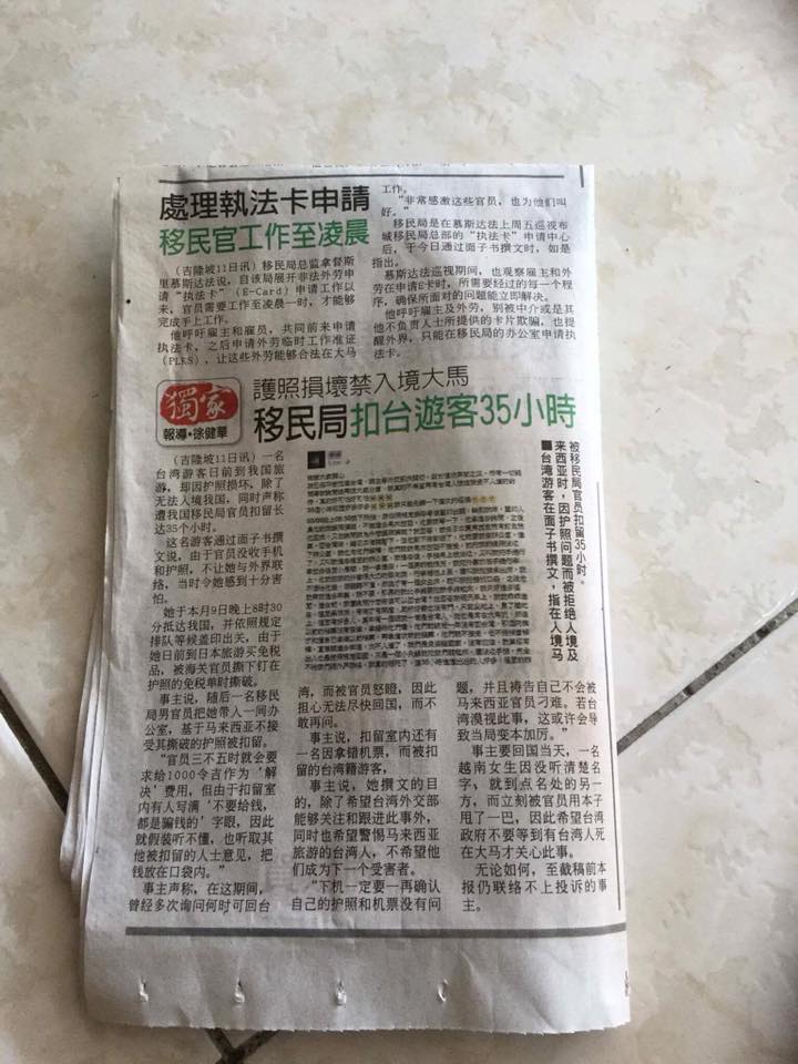 「好可怕好可怕,這真的是一個非常可怕的地方」台女驚魂未定地說,當她把這35小時驚悚的經歷PO在臉書上公開,馬上被馬國華人媒體報導,引起當地議員和政府的高度關切,回到台灣溫暖的家後,立刻吃豬腳麵線過運,甚至還洗了3次澡希望能洗掉晦氣,沉痛地回憶「在牢裡35個小時,度秒如年,我只能一直安慰自己,也許是老天保佑讓我待在牢裡,避掉大馬外面的大災難,等災難過後,我就可以平安回台,但不人道的對待,我還是不能姑息縱容真的好可怕好可怕」。