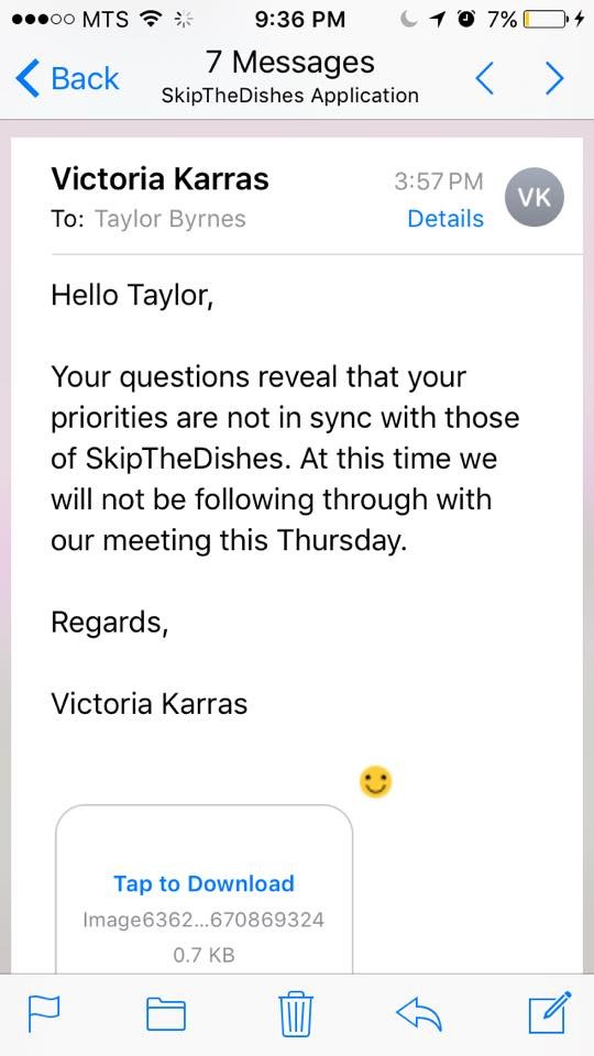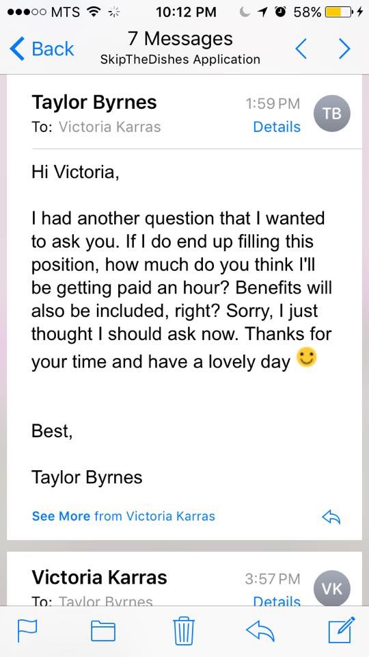 綜合外媒報導,加拿大有位溫尼伯(Winnipeg)女子拜恩妮絲(Taylor Byrnes),日前應徵一間送餐服務公司SkipTheDishes,而且還通過第一階段的電話面試,順利進入第二階段,不過就在電話面試之後,拜恩妮絲利用E-mail向人資詢問待遇和福利,然而也是因為這封信,讓她喪失了繼續面試的門票。