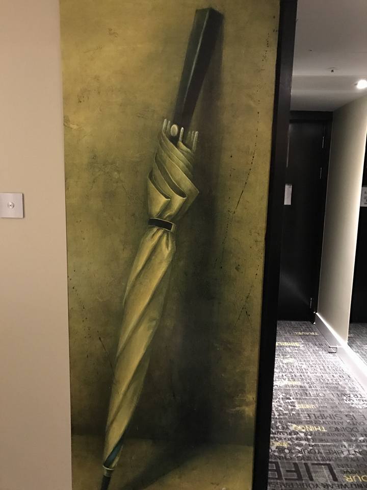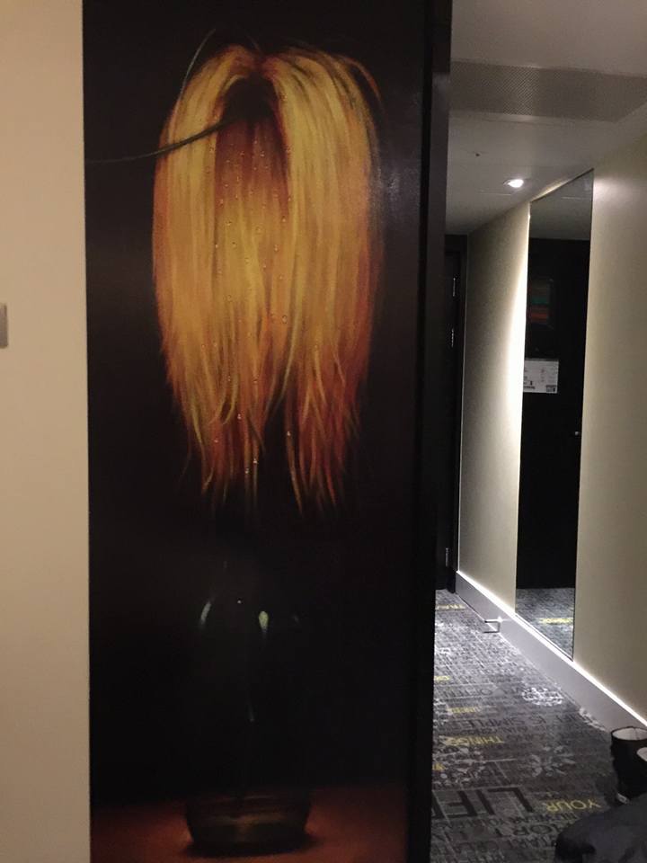 陰森之感,而且其他房間的詭異設計也不遑多讓,例如水瓶上掛了一頂黃色長假髮、穿傳統韓式服裝的女子、一把抹茶綠的長傘靠在牆上等,這些裝置藝術不知怎麼搞得,竟然都散發著濃濃的陰沉氣息,讓入住的網友好崩潰「房間裝置藝術真不知道該怎麼睡」。