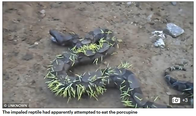 近日印尼也有一巨蟒將在攻擊一名男子後吞食,村民隔日在蟒蛇腹中驚見男子的全屍。如今卻有蟒蛇為吞食豪豬而深陷痛苦,大自然中一物剋一物,終究沒有誰是永遠的王者。