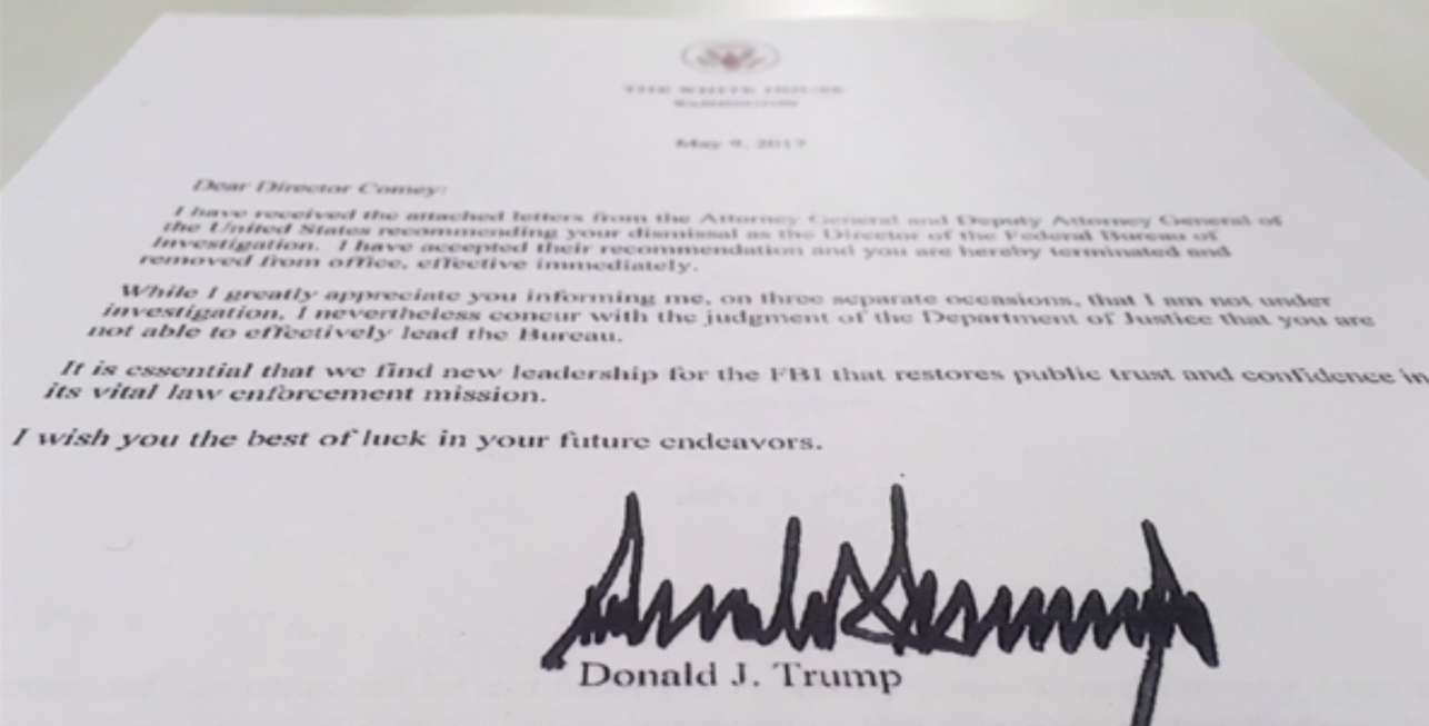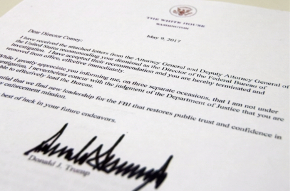 川普在親筆簽名的解雇信中指出,FBI是美國最受重視的機構之一,但經過數個月的喧鬧後,認為柯米無法有效領導調查局,所以政府將找到新的領導,以挽回大眾對最高執法部門的信任和信心,並且也在信中最後對柯米送上祝福。